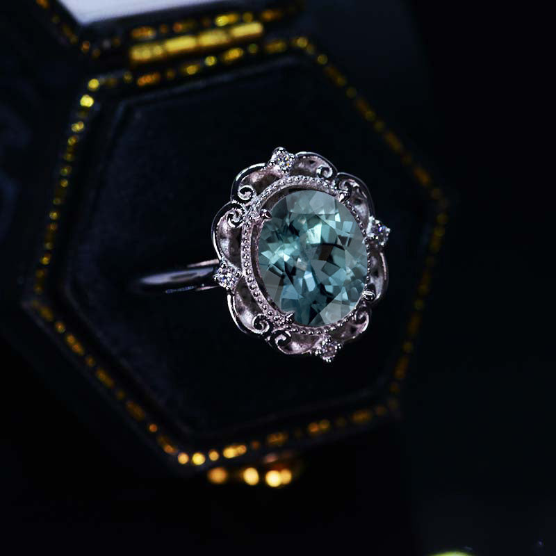 18K Solid White Gold Dainty Teal Sapphire Ring, 2ct Oval Cut Teal Sapphire Ring, Unique Oval Halo Vintage Ring