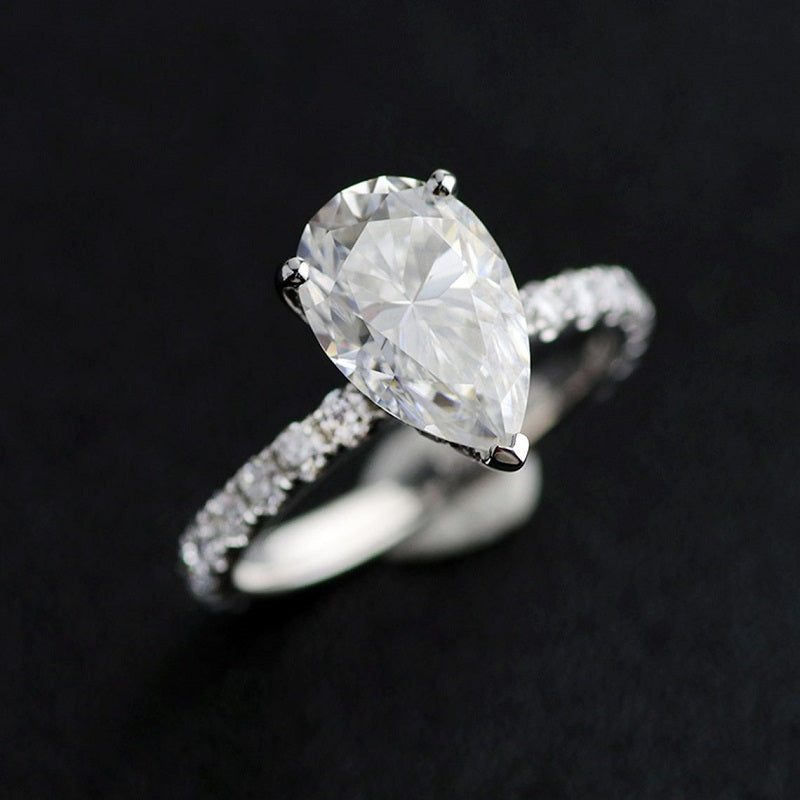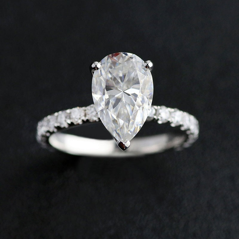 The default design option features 8x6mm Pear Cut Moissanite StoneD-Colorless, VVS1-Clarity, VG-Cut, Ex-Polish, VG-Symmetry