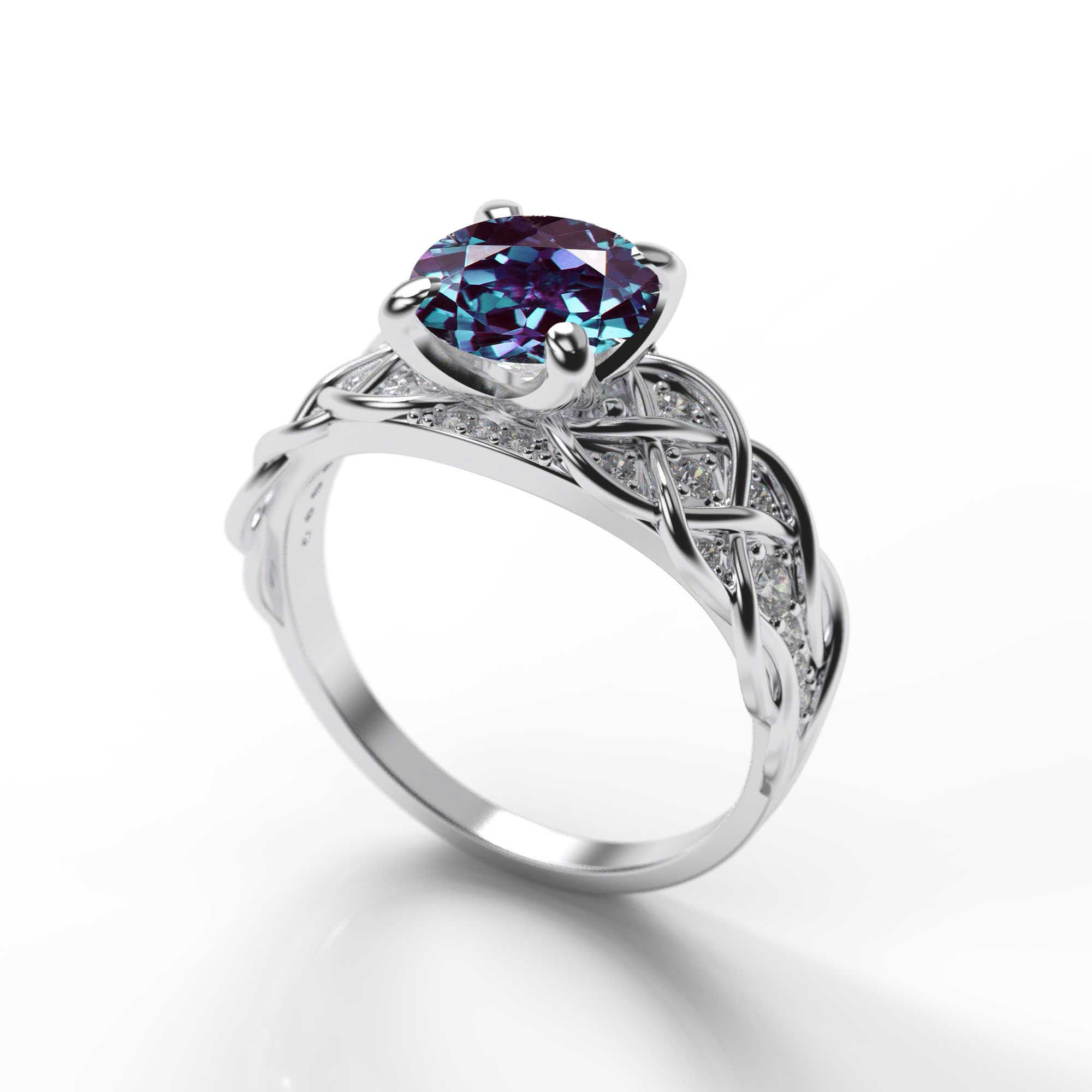 2.0 Carat Ethically Lab-Grown Alexandrite Center Stone ( Round 8mm, Ex-Cut, Ex-Polish, VG-Symmetry) and 24 Moissanite Accent Stones (0.3 CTW D-Colorless, VVS1 clarity) with 14K White Gold.