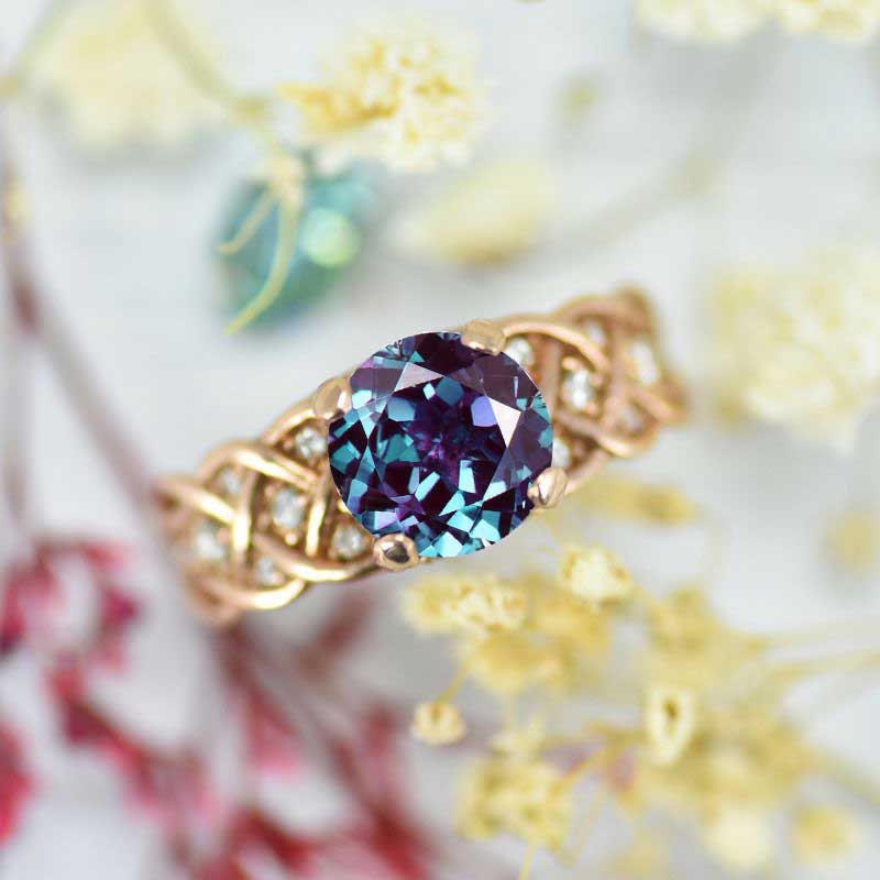 2.0 Carat Ethically Lab-Grown Alexandrite Center Stone ( Round 8mm, Ex-Cut, Ex-Polish, VG-Symmetry) and 24 Moissanite Accent Stones (0.3 CTW D-Colorless, VVS1 clarity) with 14K Rose Gold. Model 19
