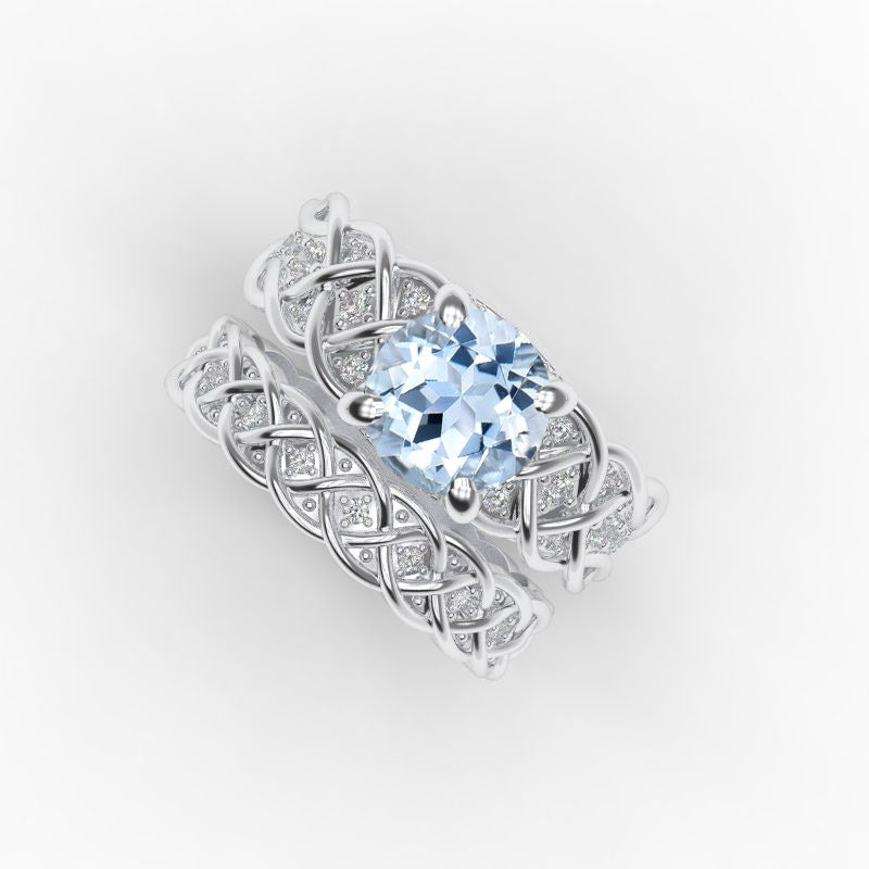 This one of a kind ring features beautiful lattice design which embeds gorgeous jewels of your choice and elegantly twists into the main center stone .