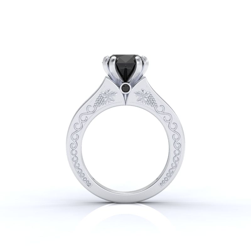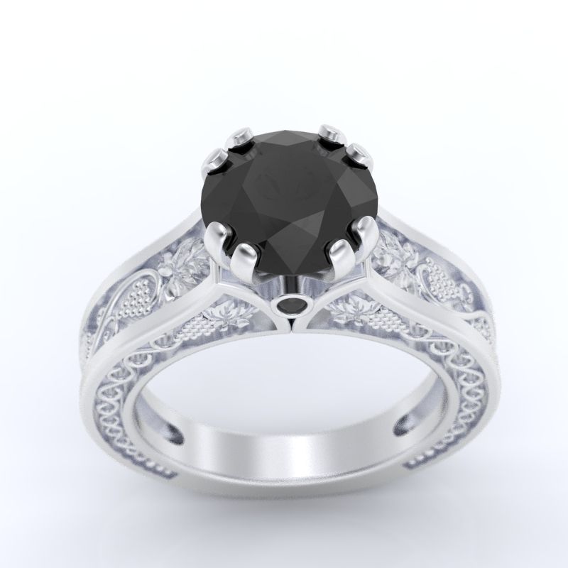 2.0 Carat Genuine Black Diamond Center Stone ( Round 8 mm, I2-Clarity, Ex-Cut, Ex-Polish, VG-Symmetry) and 2 Diamond Accent Stones