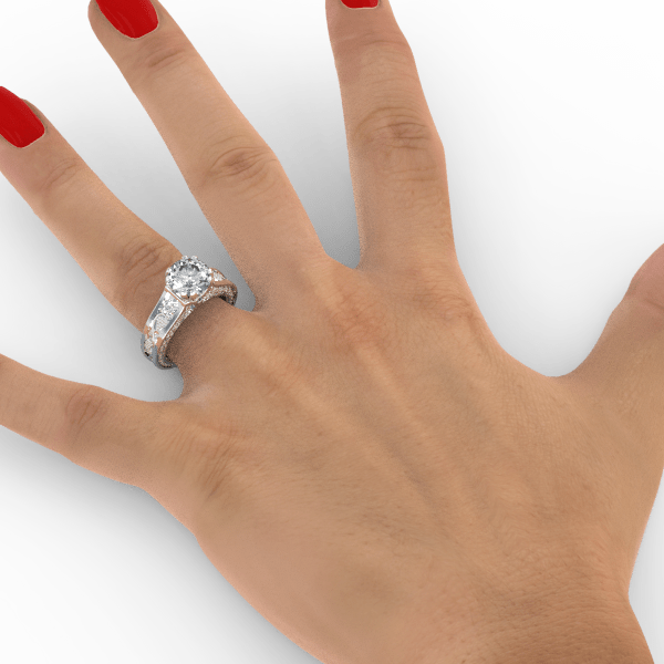 This ring decorated with high quality natural diamonds as accent stones and beautiful floral design. The center moissanite stone perfectly completes the design concept.