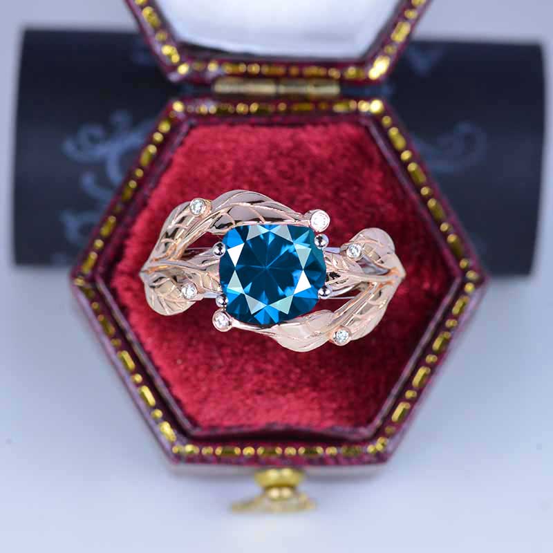 2.0 Carat Ethically Lab-Grown Cornflower Sapphire Center Stone with 6 0.1 CTW Moissanite (D-Colorless, VVS1 clarity) Accent Stones 14K Rose or Yellow Gold with White Gold Ring Shank.