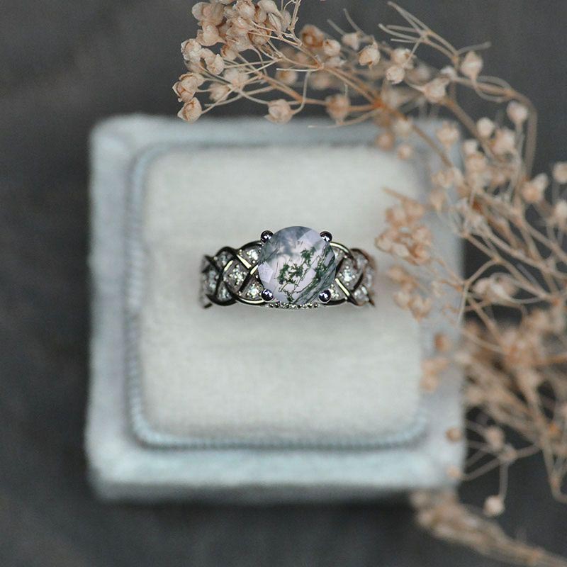 2.0 Carat Genuine Moss Agate Engagement White Gold Ring Model 19