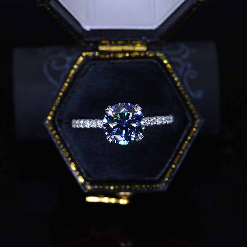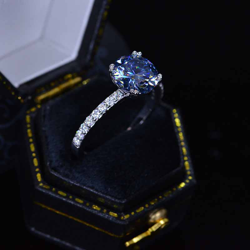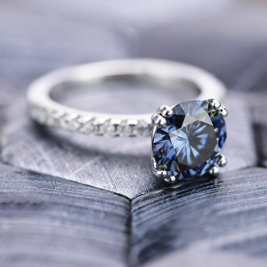 This ring decorated with high quality round 8mm (2 carat Giliarto VVS1-Clarity, VG-Symmetry) DARK GRAY-BLUE color moissanite center stone and accent stones 0.1 CTW D-colorless, VVS1 clarity with 14K White Gold.