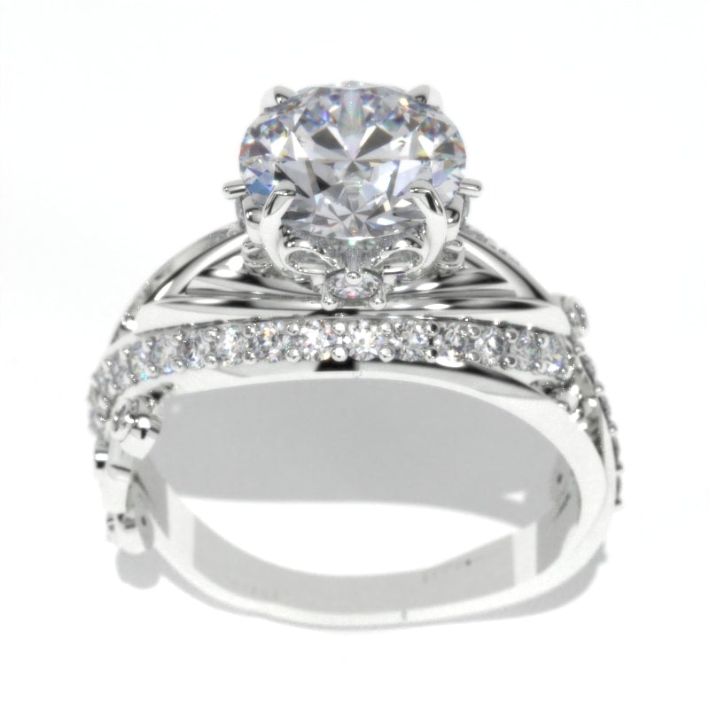 2.0 Carat Moissanite (Round 8mm, D-Colorless, VVS1-Clarity, Ex-Cut, Ex-Polish, VG-Symmetry) Ring with 126-0.3 Carat T.W. D-Colorless, VVS1 clarity accent stones and 14K White Gold Ring.Â