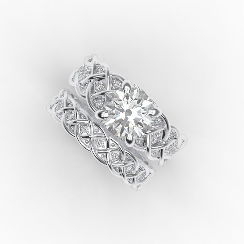 This one of a kind ring features beautiful lattice design which embeds gorgeous jewels of your choice and elegantly twists into the main center stone .