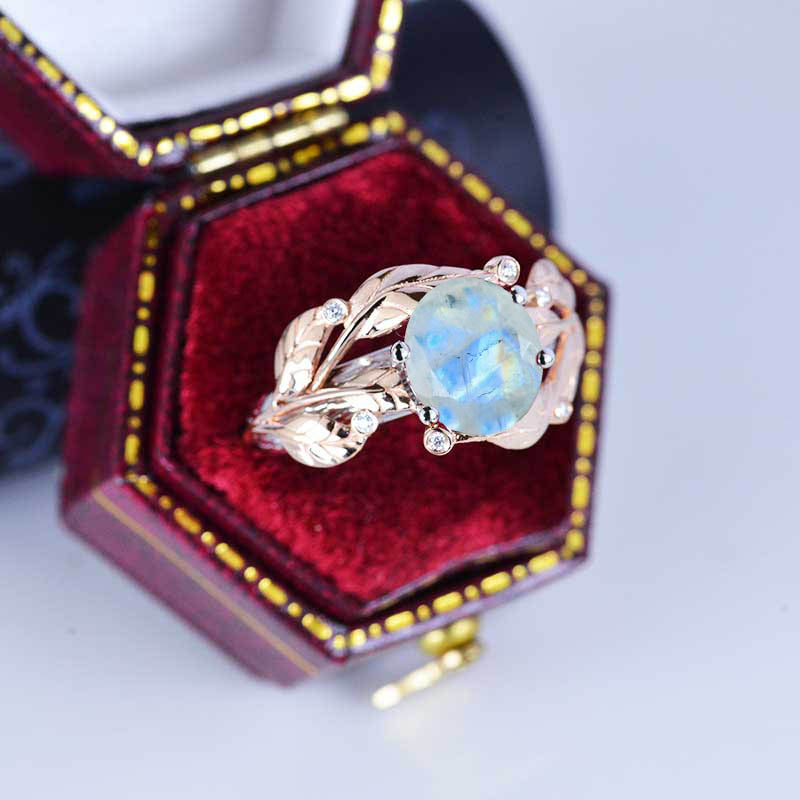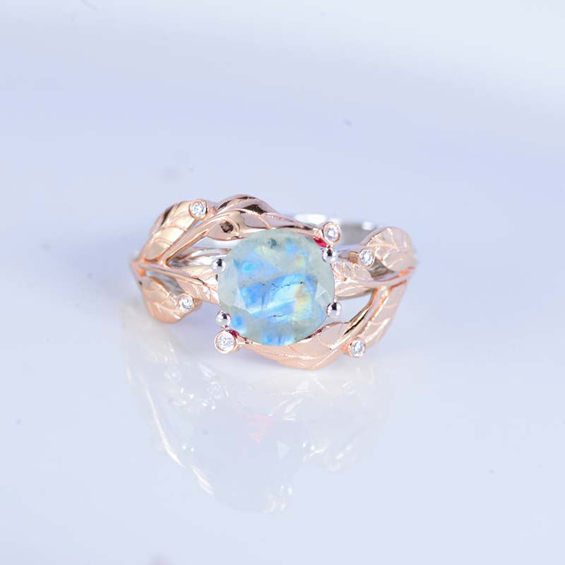 ModelĀ 2.0 CaratĀ Genuine Moonstone Center Stone with 6 0.1 CTW Moissanite (D-Colorless,Ā VVS1 clarity) Accent Stones 14KĀ Rose or Yellow GoldĀ with White Gold Ring Shank.