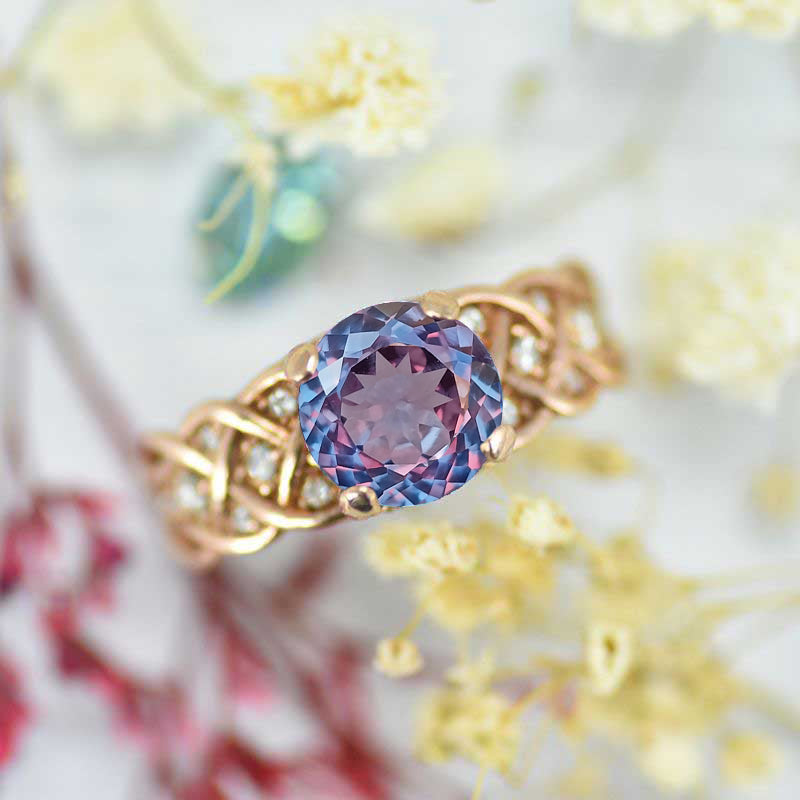 2.0 Carat Portuguese Cut Ethically Lab-Grown Alexandrite Center Stone ( Round 8mm, Ex-Cut, Ex-Polish, VG-Symmetry) and 24 Moissanite Accent Stones (0.3 CTW D-Colorless, VVS1 clarity) with 14K Rose Gold. Model 19