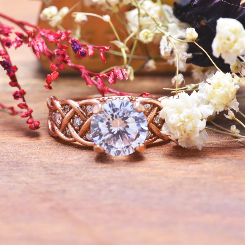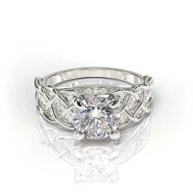 This one of a kind ring features beautiful lattice design which embeds gorgeous jewels of your choice and elegantly twists into the main center stone .