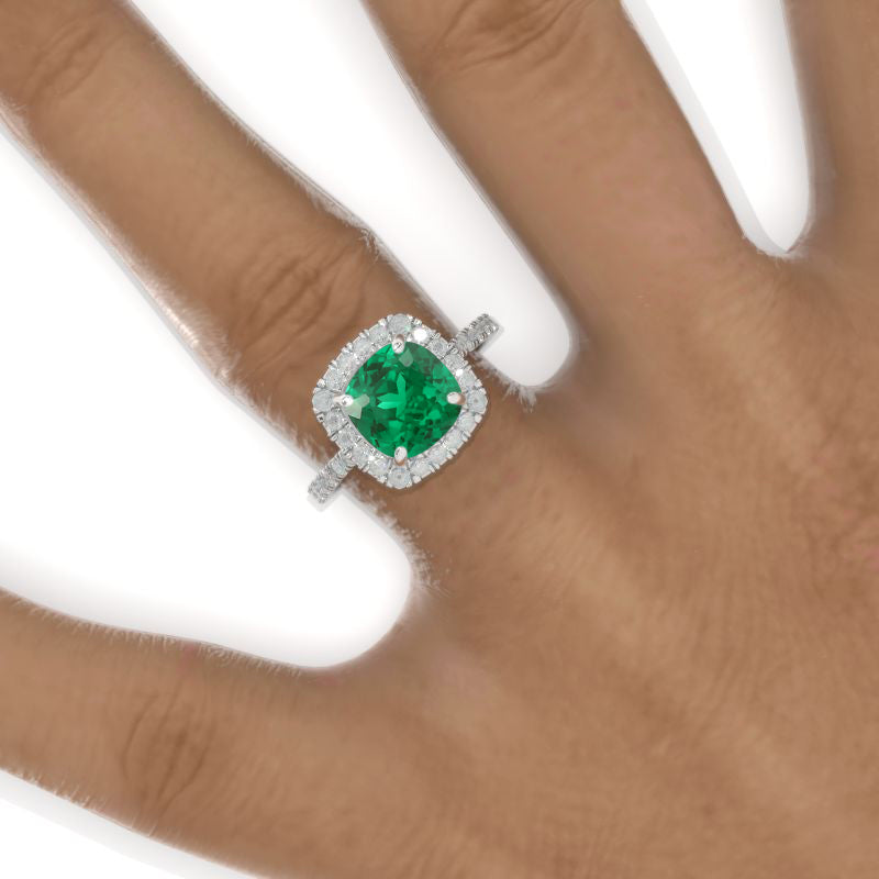 The default design option features 8x8mm Cushion Brilliant Cut Ethically Lab-Grown Emerald Stone