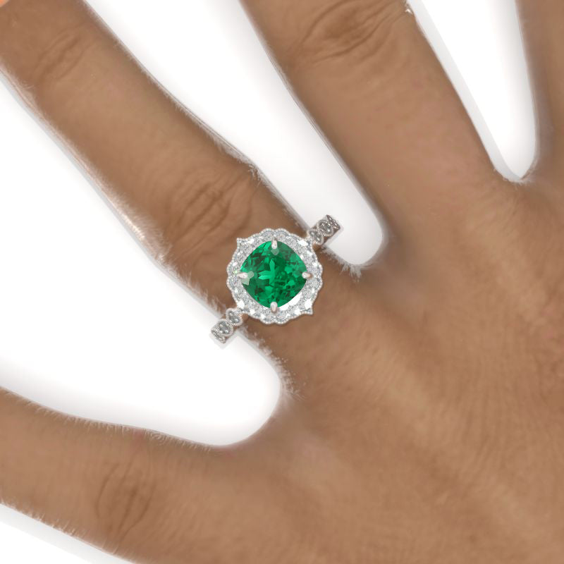 2.5 Carat Cushion Emerald Halo Engagement Ring. Victorian 14K White Go - Giliarto