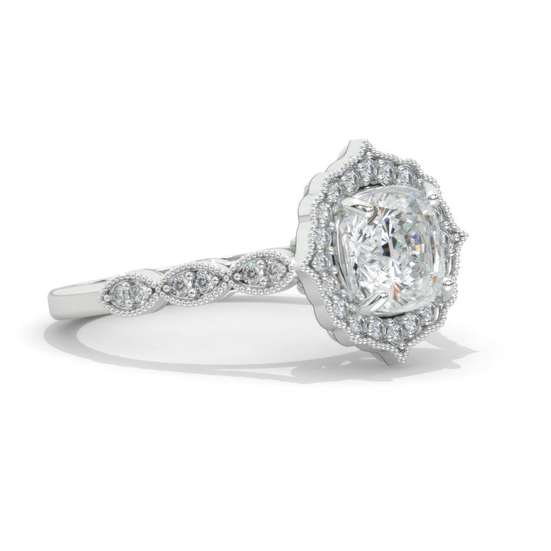 2.5 Carat Cushion LAB-Grown Diamond Halo Engagement Ring. Victorian 14K White Gold Ring Model 803