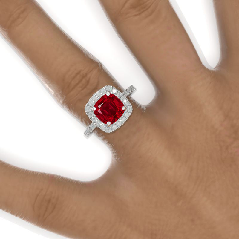 2.5 Carat Cushion Ruby Halo Engagement Ring. Victorian 14K White Gold - Giliarto
