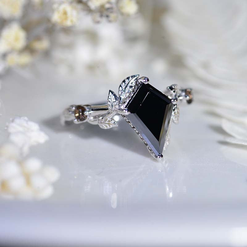 2.5 Carat Kite Black Moissanite Twig Floral Leaf 14K White Gold Engagement Ring