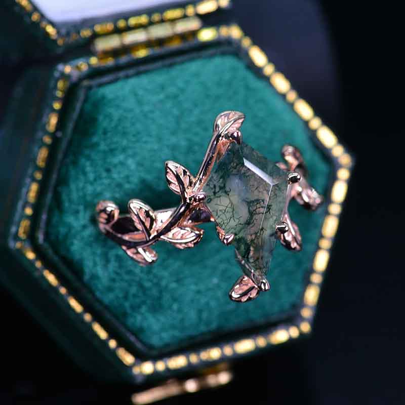 2.5 Carat Kite Genuine Moss Agate Engagement Ring. 2.5CT Fancy Shield Shape Moss Agate Rose Gold Ring Model 788-12x8