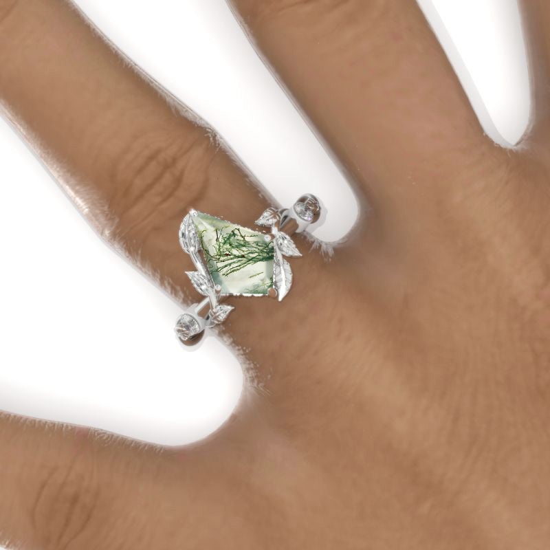 2.5 Carat Kite Genuine Moss Agate Twig Floral Leaf 14K White Gold Engagement Ring Model 984-12x8