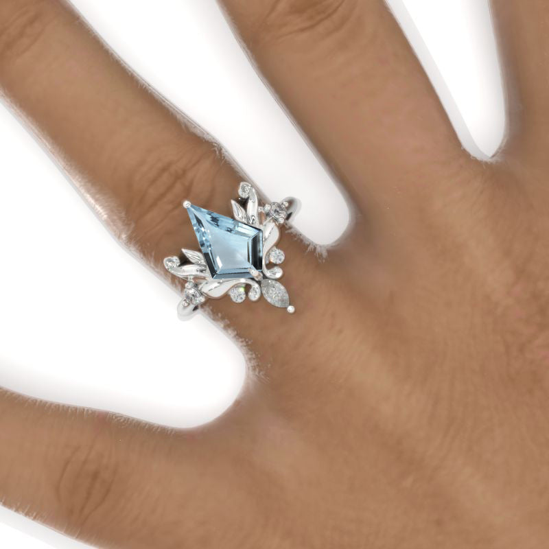 2.5 Carat Kite Genuine Natural Aquamarine Floral Leaves 14K White Gold Engagement Ring