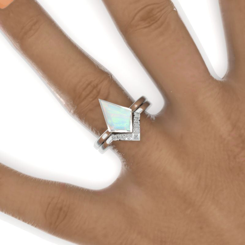 2.5 Carat Kite Genuine Natural White Opal Engagement Ring. 2.5CT Fancy Shield Shape White Opal Ring Set