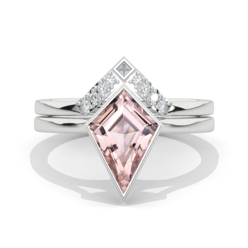 The default design option features 12x8mm Kite Center Genuine Peach Morganite Stones,Ā VVS1-Clarity, VG-Cut, Ex-Polish, VG-Symmetry,Ā Set with Colorless Moissanite Accent stones in 14K White Gold Engagement Ring.Ā