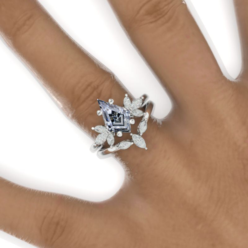 The default design option features 12x8mm Kite Center Gray Moissanite Stones,Â