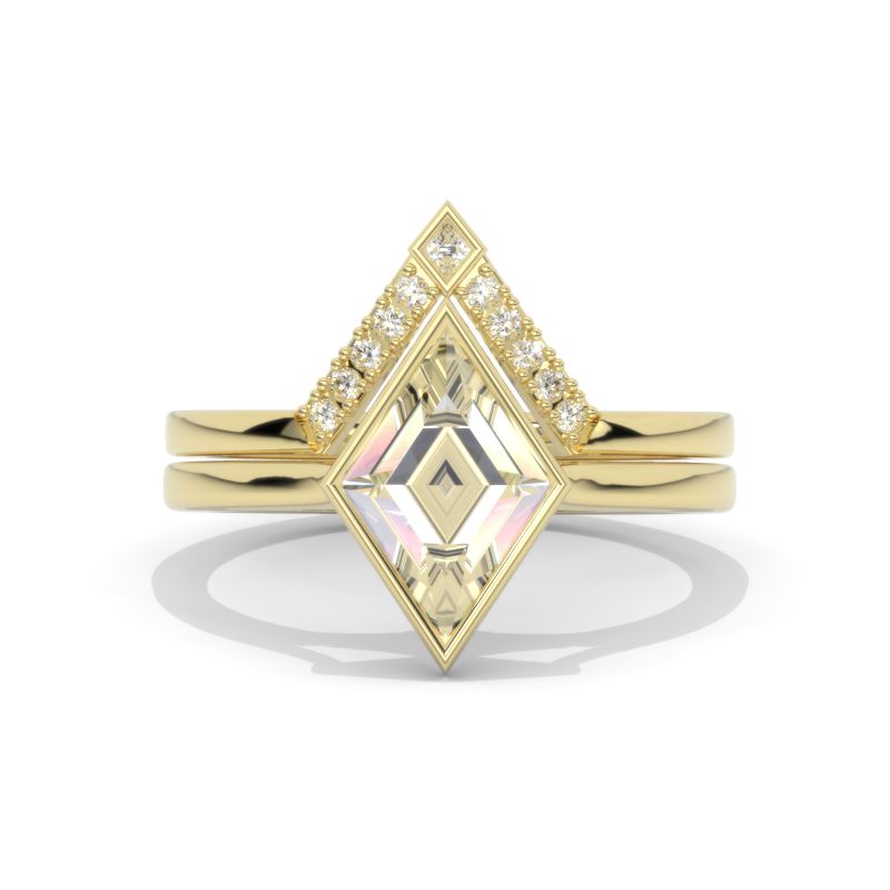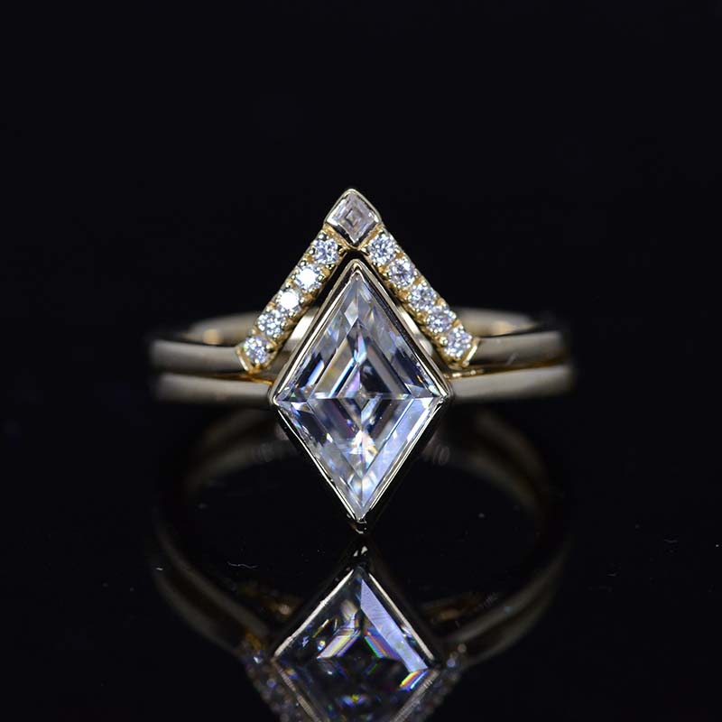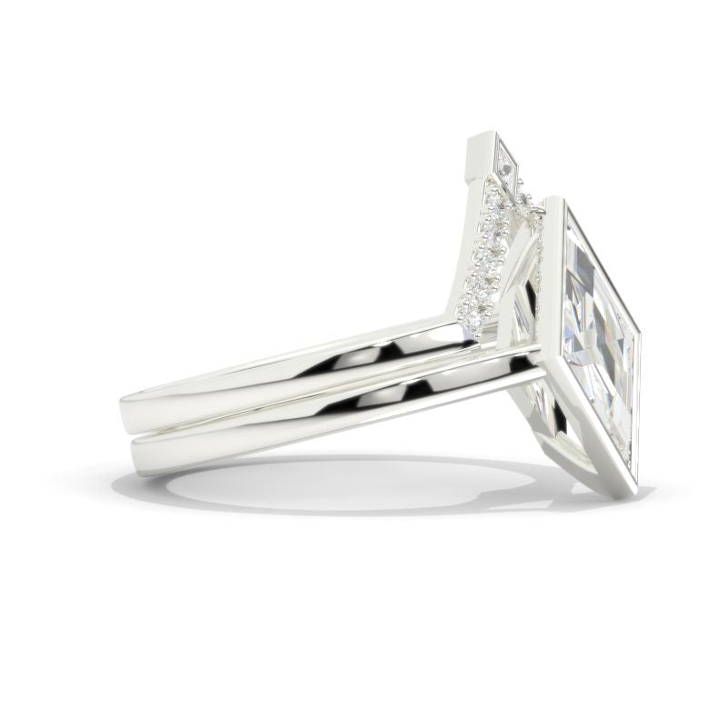 The default design option features 12x8mm Lozenge Center Moissanite Stones,Â