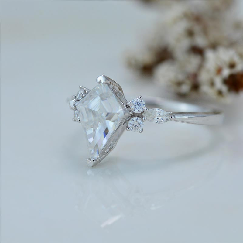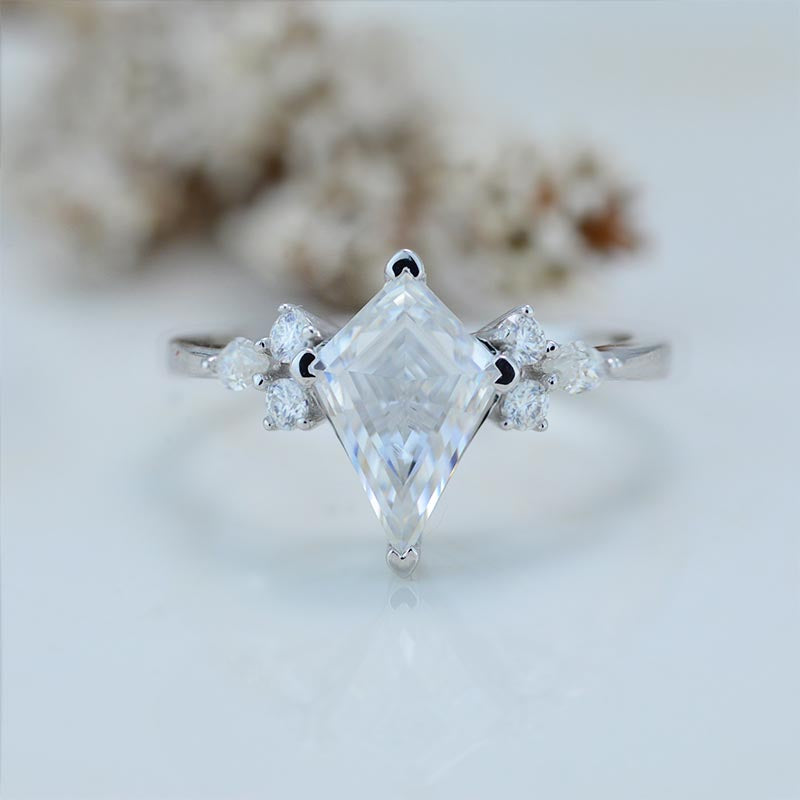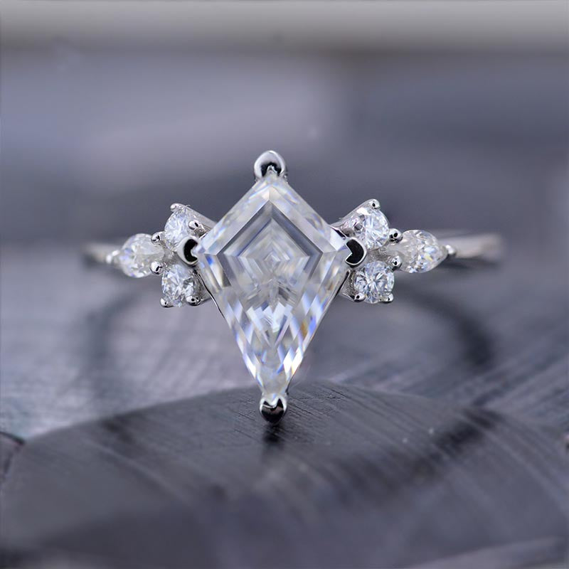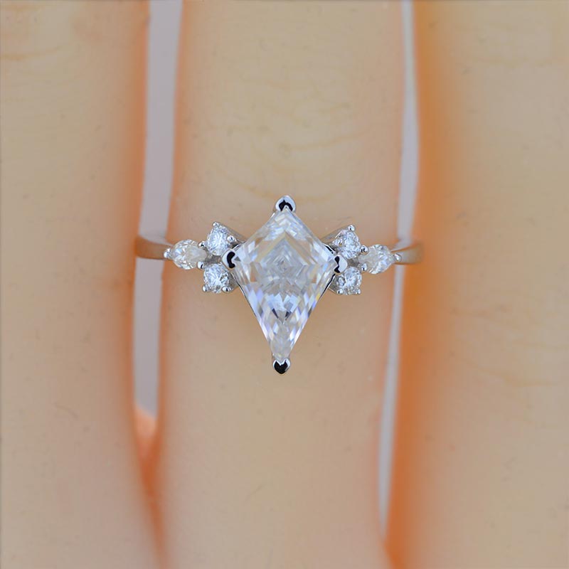 The default design option features 12x8mm Kite Center Moissanite Stones,Â