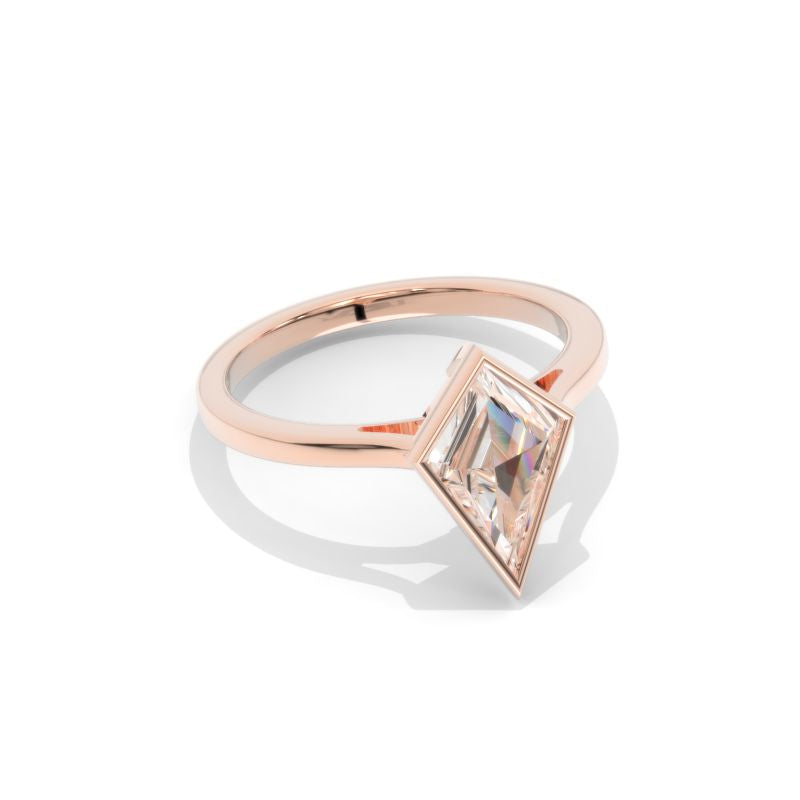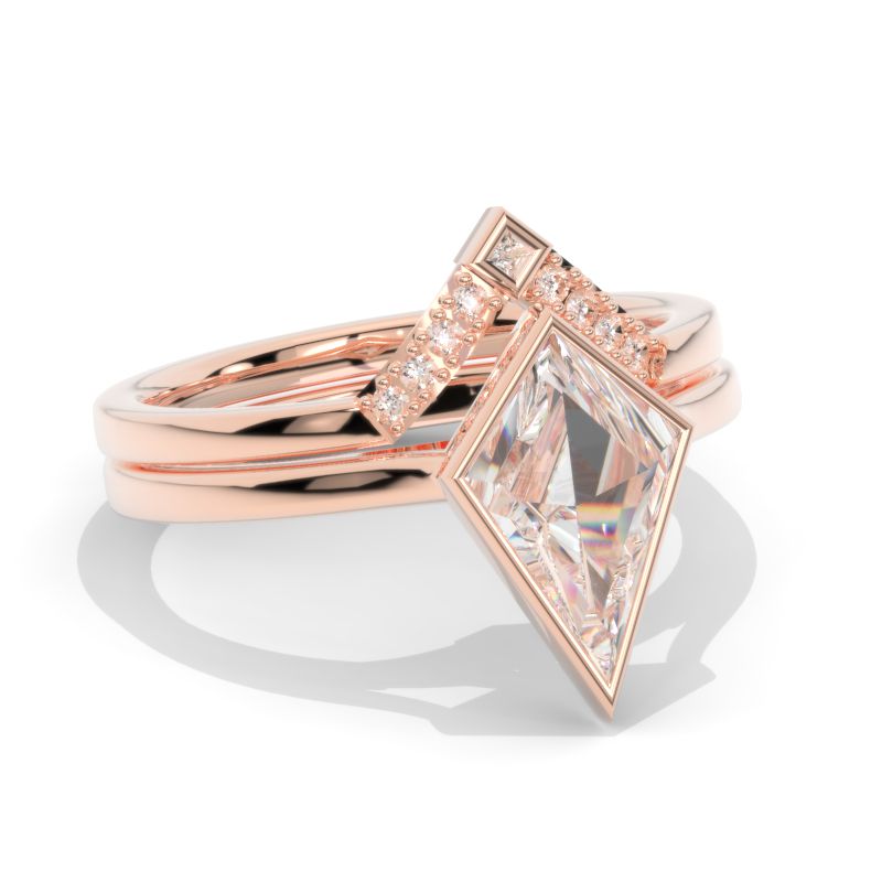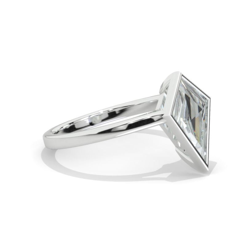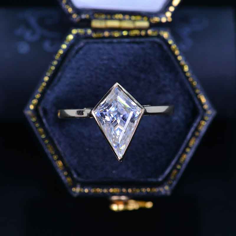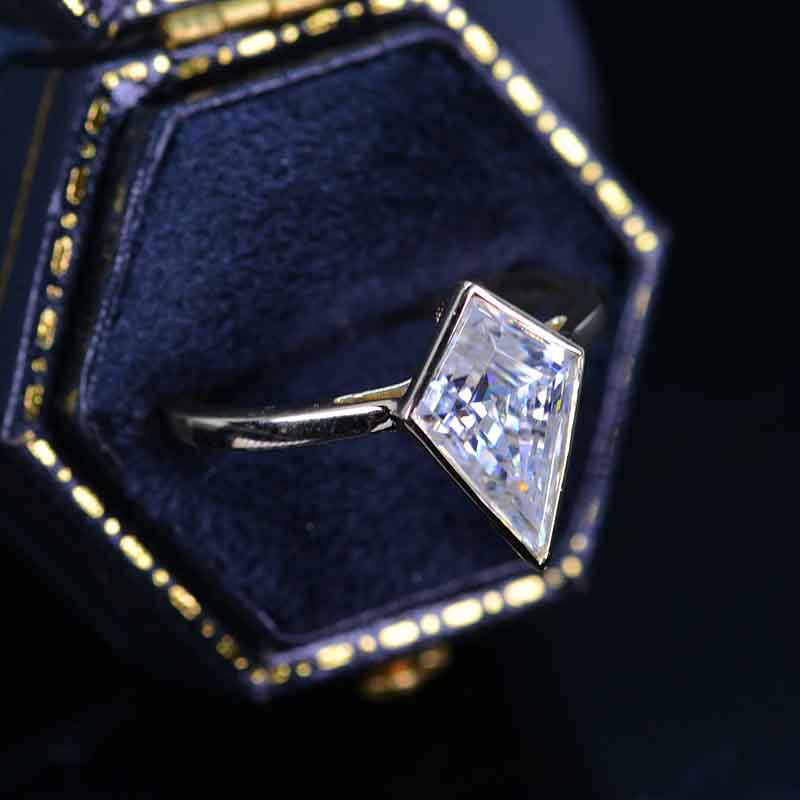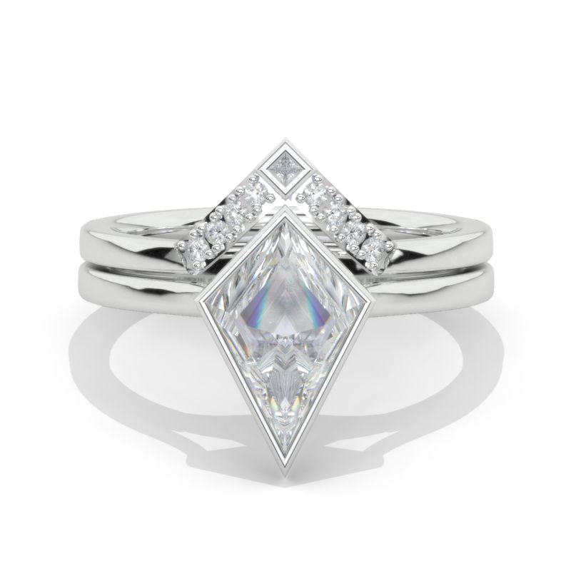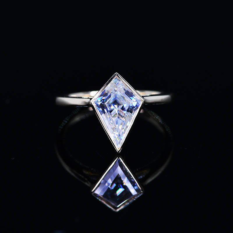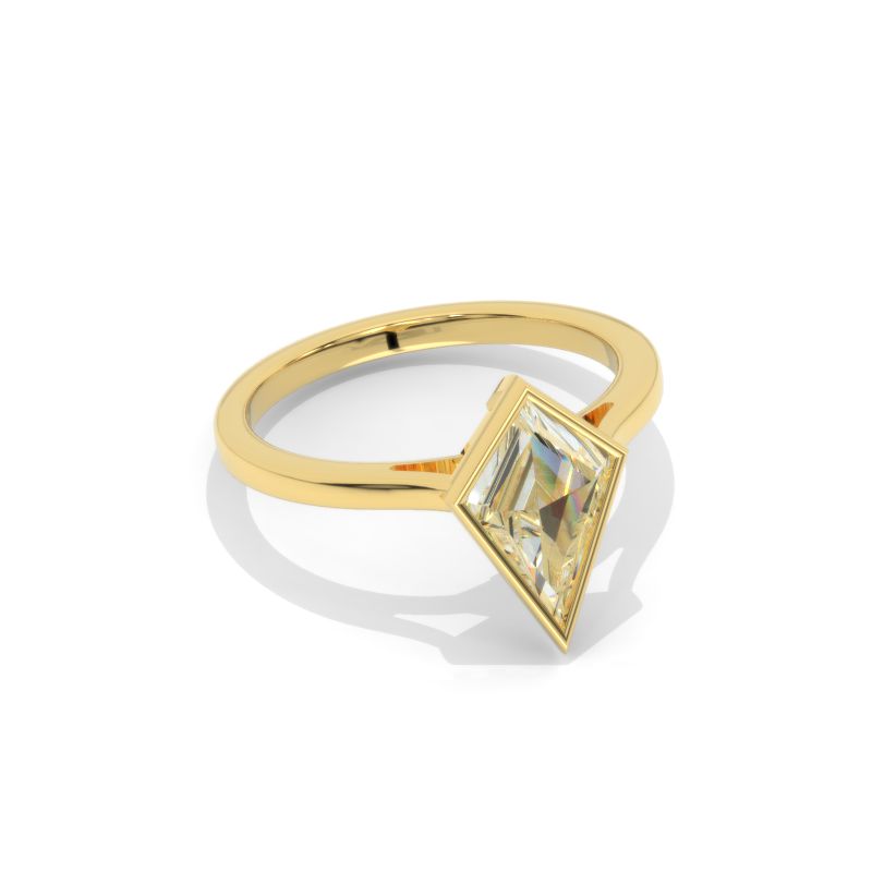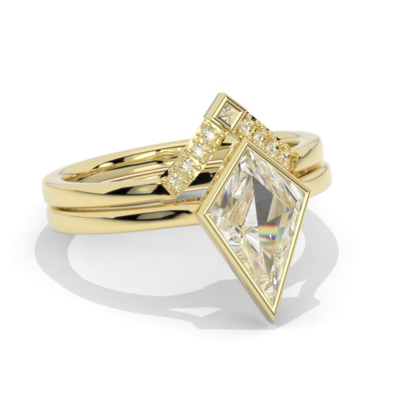 The default design option features 12x8mm Kite Center Moissanite Stones,  D-Colorless, VVS1-Clarity, VG-Cut, Ex-Polish, VG-Symmetry, Set with Colorless Moissanite Accent stones in 14K Yellow Gold Engagement Ring.Â