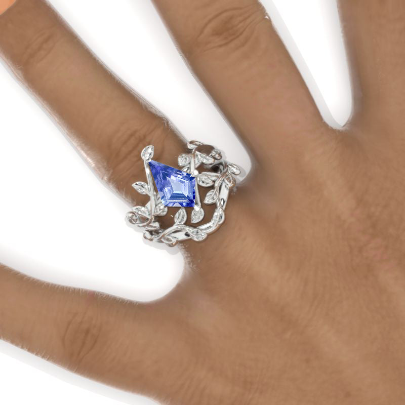 The default design option features 12x8mm Kite Center Natural Genuine Tanzanite Stones, VG-Cut, Ex-Polish, VG-Symmetry set with D- Colorless Moissanite Accent Stones