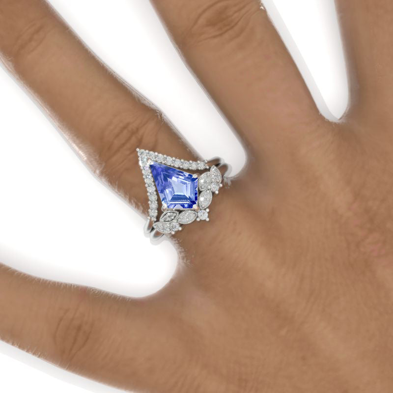 The default design option features 12x8mm Kite Center Natural Genuine Tanzanite Stones, VG-Cut, Ex-Polish, VG-Symmetry, Set with Colorless Moissanite Accent Stones in 14K White Gold Engagement Ring Set.