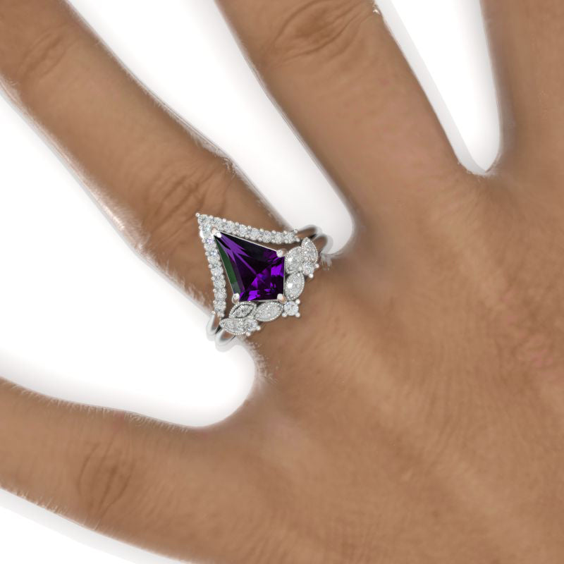 2.5 Carat Kite Purple Sapphire Halo Engagement Ring Set. 2.5CT Fancy Kite Shape Purple Sapphire Ring Set
