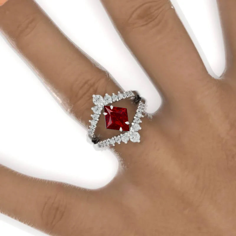 The default design option features 12x8mm Kite Center Ethically Lab-Grown Ruby AAA+ Grade Stone andĀ  Moissanite Accent StonesĀ