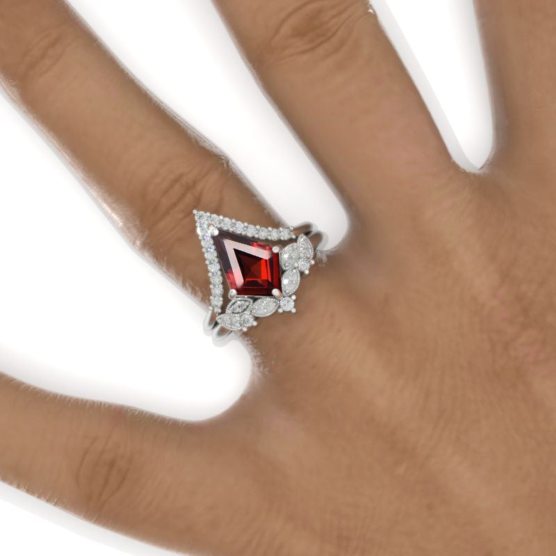 2.5 Carat Kite Ruby Halo Engagement Ring Set. 2.5CT Fancy Kite Shape Ruby Ring Set