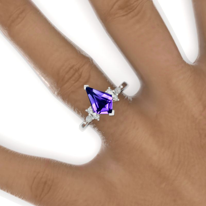The default design option features 12x8mm Kite Center Genuine Natural Amethyst- AAAA Grade Stones, VG-Cut, Ex-Polish, VG-Symmetry Set with Colorless Moissanite Accent stones in 14K White Gold Engagement Ring.