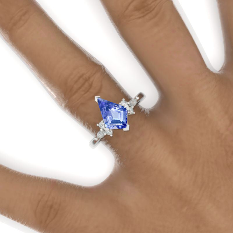The default design option features 12x8mm Kite Center Natural Genuine Tanzanite Stones, VG-Cut, Ex-Polish, VG-Symmetry Set with Colorless Moissanite Accent stones in 14K White Gold Engagement Ring.