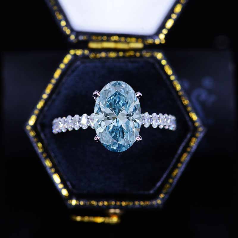 The default design option features approximately 2.5+ Carat Oval Cut 12x8mm Lab-Grown Diamond Center Stone Fancy Vivid Blue Color, VVS1-Clarity, VG-Cut, Ex-Polish, VG-Symmetry with 0.5 CTW D Accents
