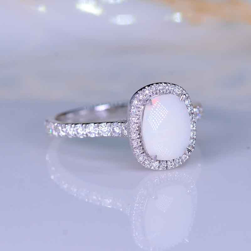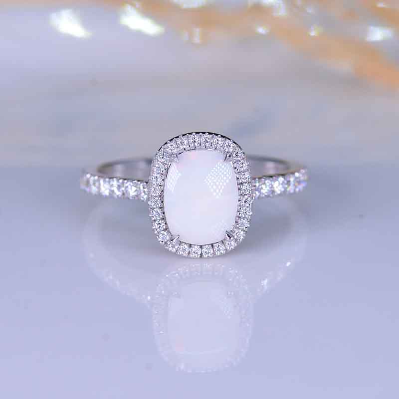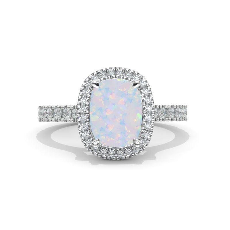 2.5Ct Cushion Genuine Natural White Opal 14K White Engagement Ring, Cushion Halo Engagement Ring