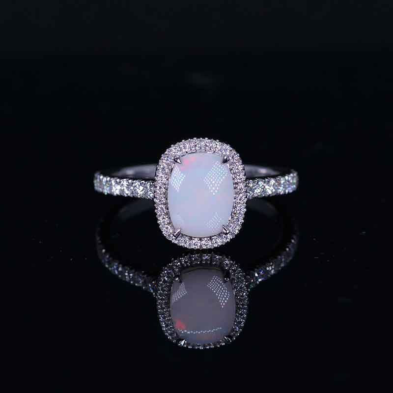 The default design option features 9x7mm Cushion Cut Genuine Natural White OpalĀ stone,Ā VVS1-Clarity, VG-Cut, Ex-Polish, VG-Symmetry