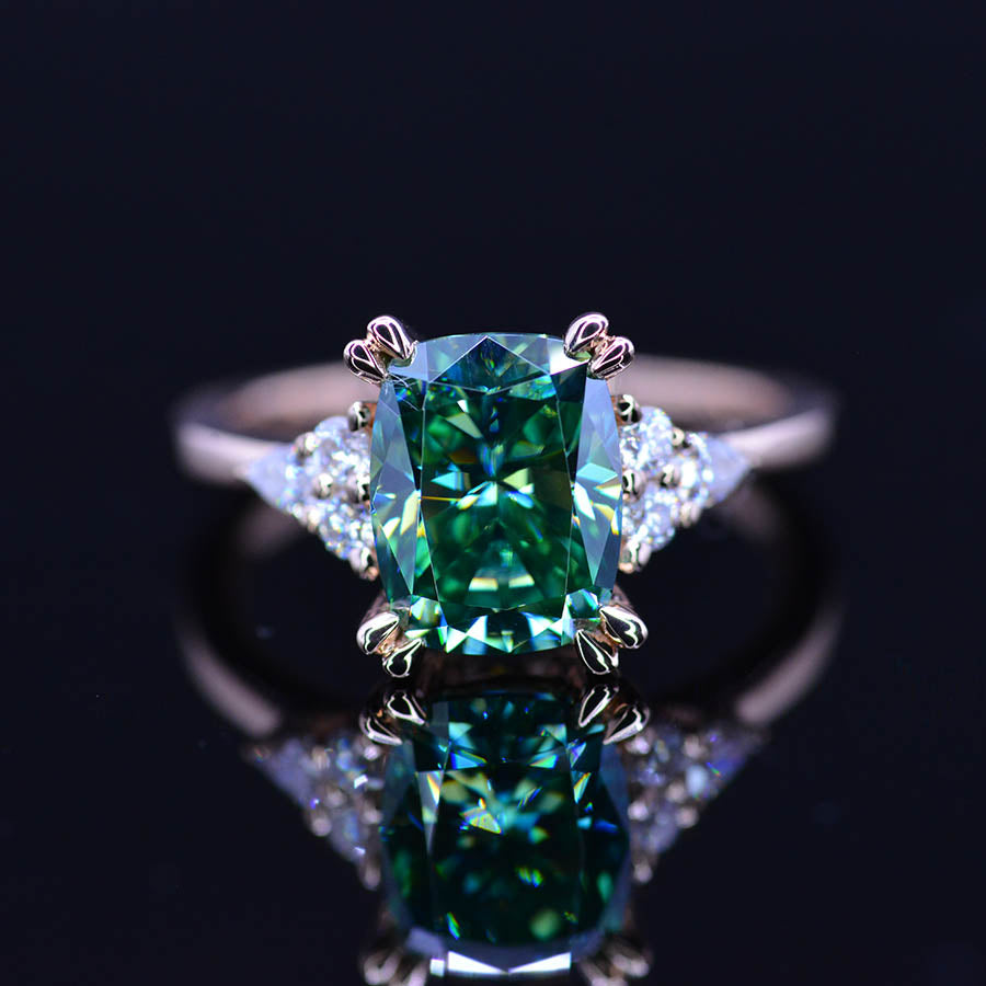 The default design option features  9x7mm Cushion Green Moissanite Stone, VVS1-Clarity, VG-Cut, Ex-Polish, VG-Symmetry with D-Colorless Accents Stones
