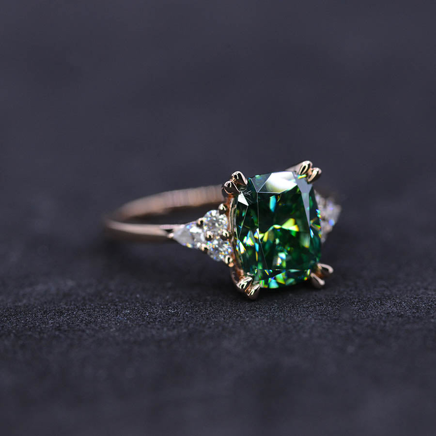 2.5Ct Cushion Green Moissanite Vintage Engagement Ring, Cushion Moissanite Engagement Ring, Marquise Side Accents Stones 14K Rose Gold Ring