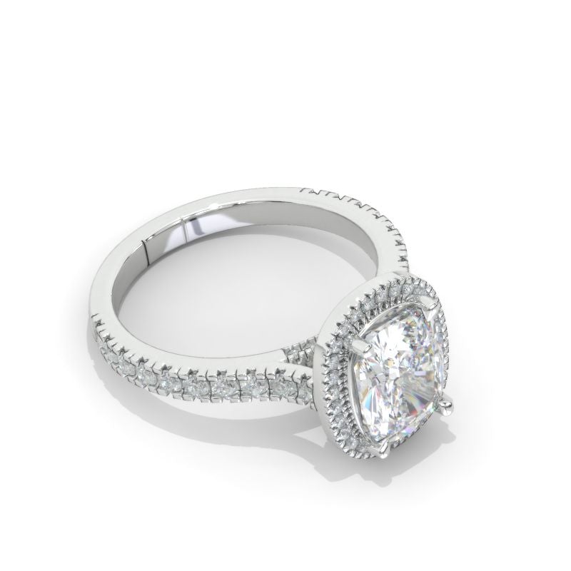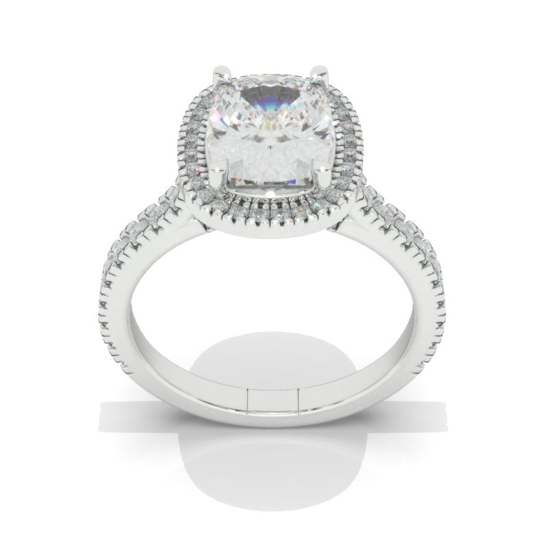 The default design option features 9x7mm Step Cut Moissanite stone,Â