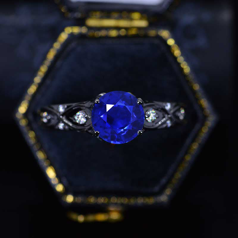 2 Carat LAB-Grown Royal Blue Sapphire Center Stone - Round 8mm, VVS2-Clarity, Ex-Cut, Ex-Polish, VG-Symmetry) and 8 - Accents 0.1 CTW with 14K Black Gold.