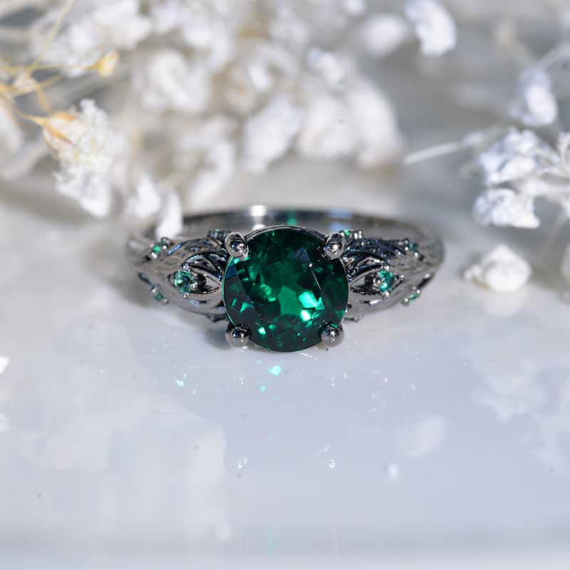 Emerald Center Stone - Round 8 mm, Ethically Lab-Grown, VVS1-Clarity, Ex-Cut, Ex-Polish, VG-Symmetry) and 8-Accents  0.1 CTW with Silver / 14K or PT900 Platinum.