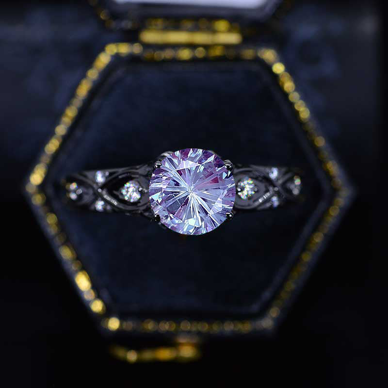 2 Carat Fireworks Cut Ethically LAB-Grown Alexandrite Center Stone - Round 8mm, VVS2-Clarity, Ex-Cut, Ex-Polish, VG-Symmetry) and 8 - Accents 0.1 CTW with 14K Black Gold.