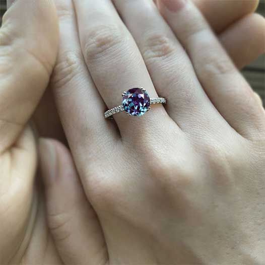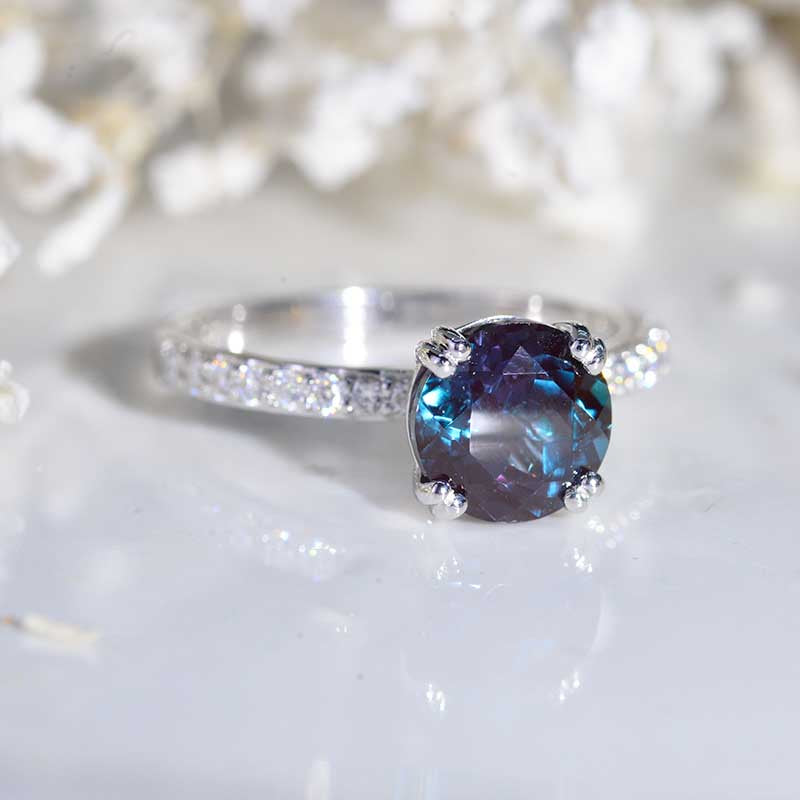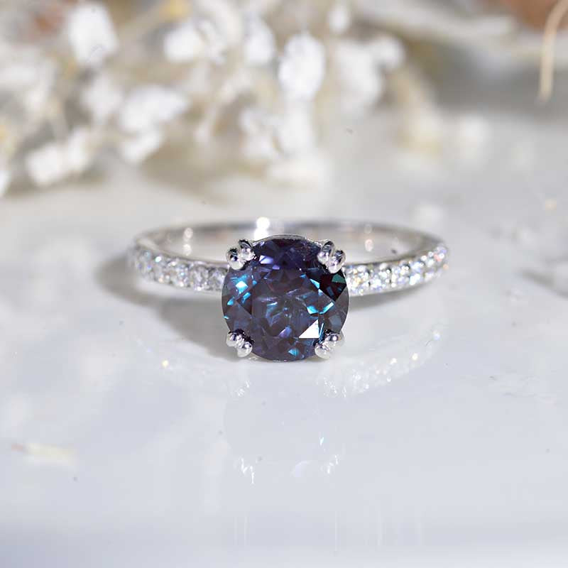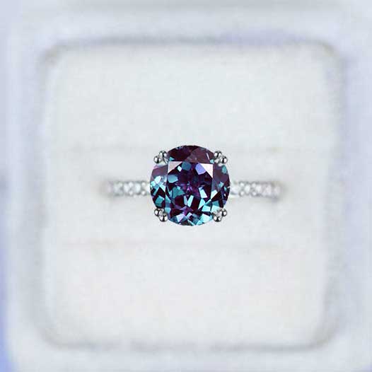 On the image featured 2 carat round Ethically Lab-Grown Alexandrite 8 mm round brilliant cut