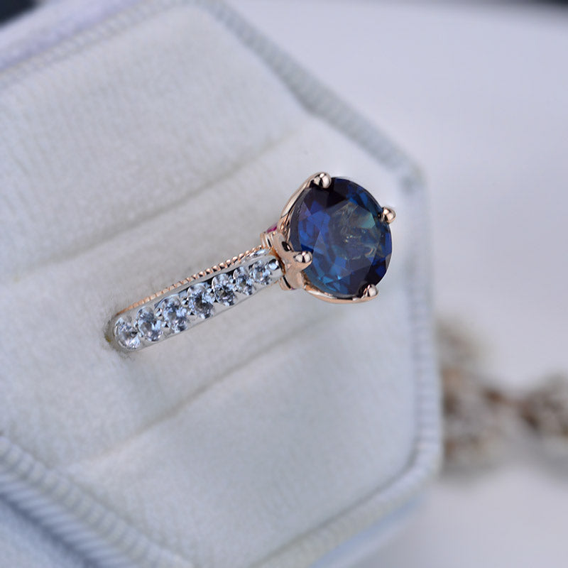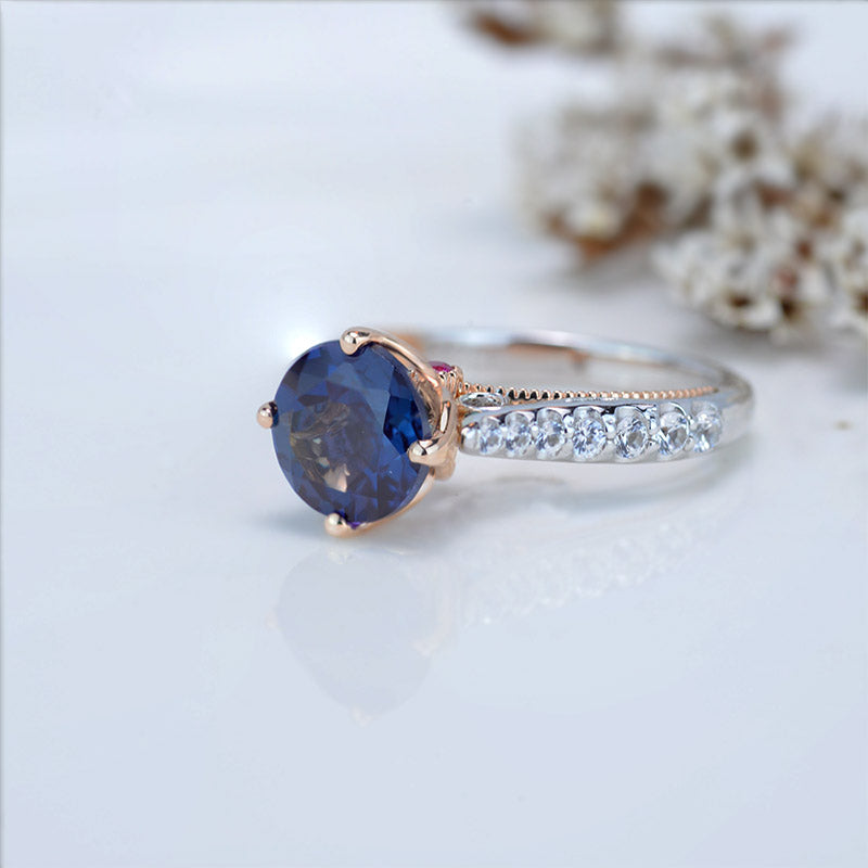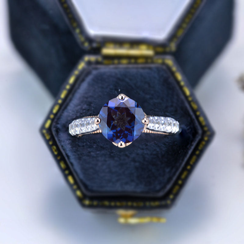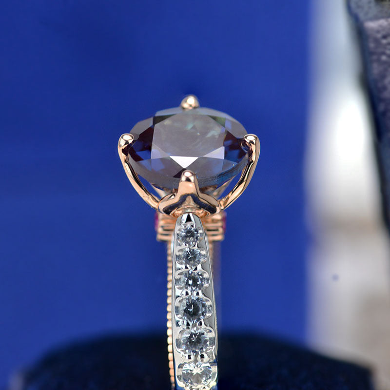 2 Carat Ethically LAB-Grown Alexandrite center stone (VVS1-Clarity, Ex-Cut, Ex-Polish, VG-Symmetry) and 16 Moissanite accent stones (0.3 CTW D-Colorless, VVS1 clarity) with 14K white/rose gold.