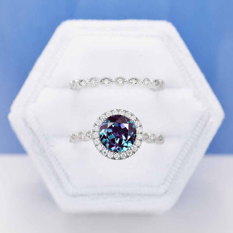 2 Carat Alexandrite Halo Engagement Eternity Two Rings Set - Giliarto