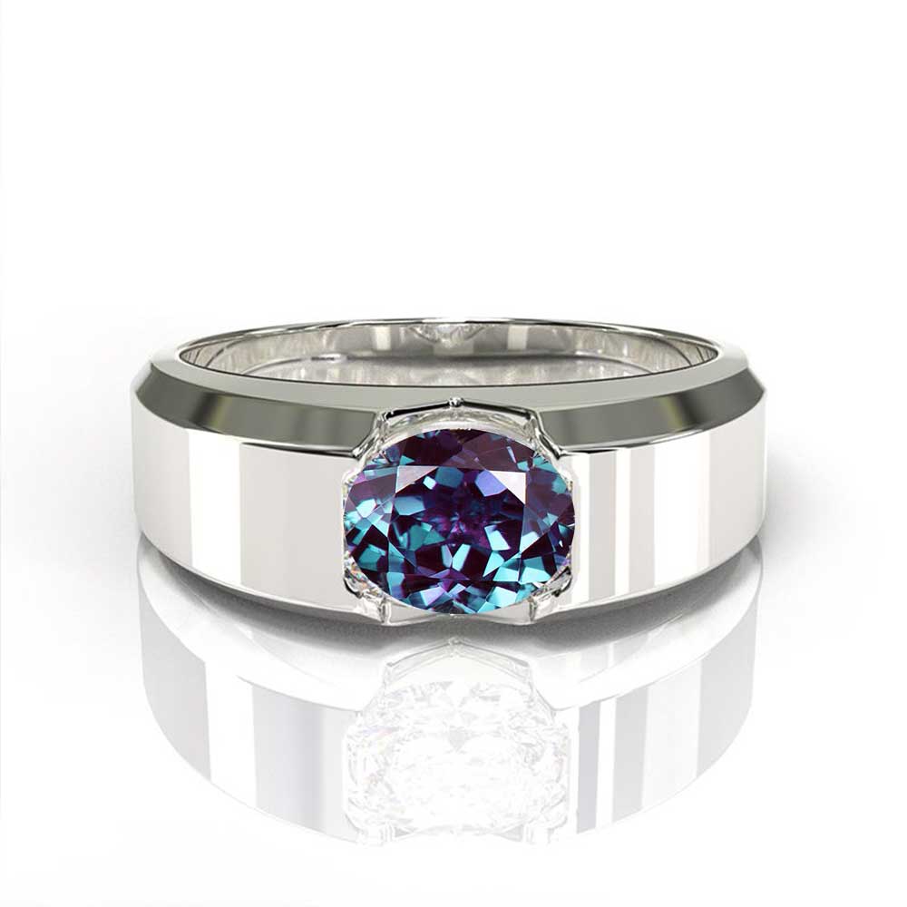 2 Carat Ethically Lab-Grown Alexandrite Oval 9x7mm, Ex-Cut, Ex-Polish, VG-Symmetry in 14K White Gold Men's Ring.