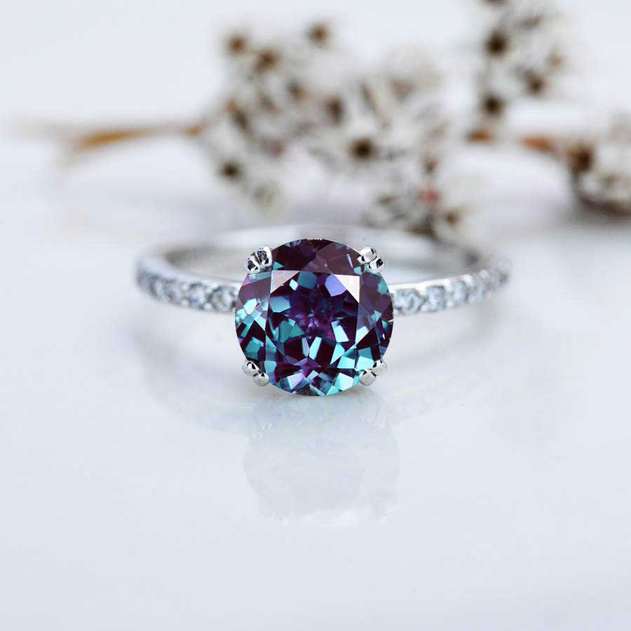 This ring decorated with high quality Round 8mm (2 Carat, VG-Symmetry)  Ethically Lab-Grown Alexandrite center stone and accent stones 0.1 CTW D-Colorless, VVSclarity with 14K White Gold.